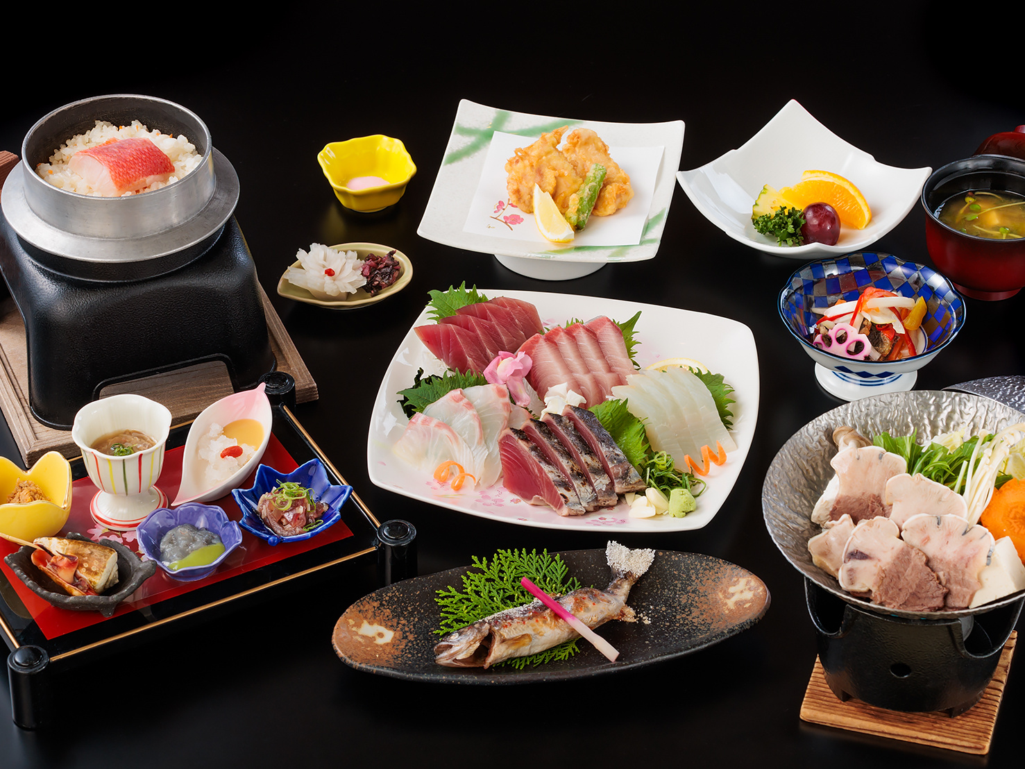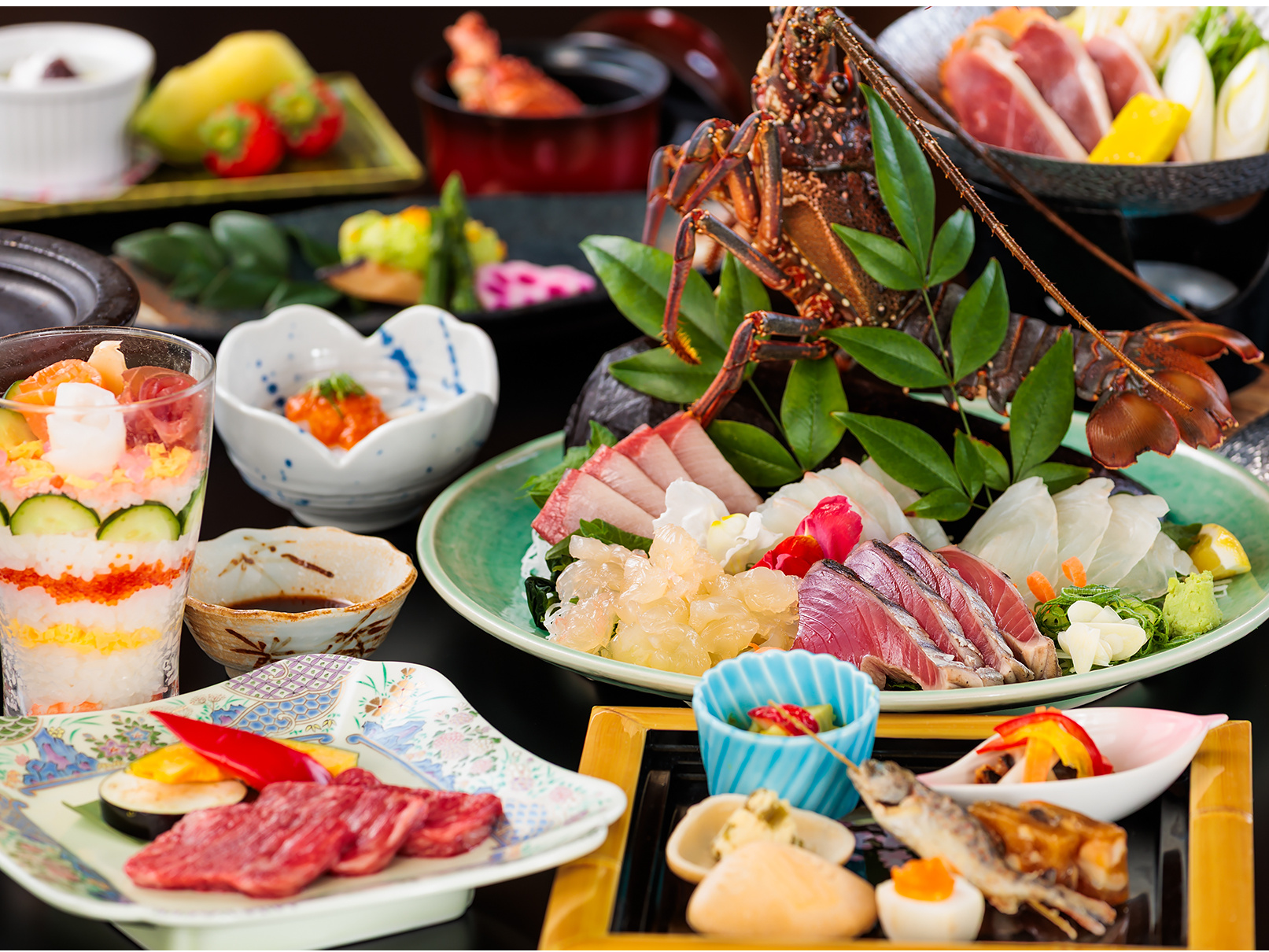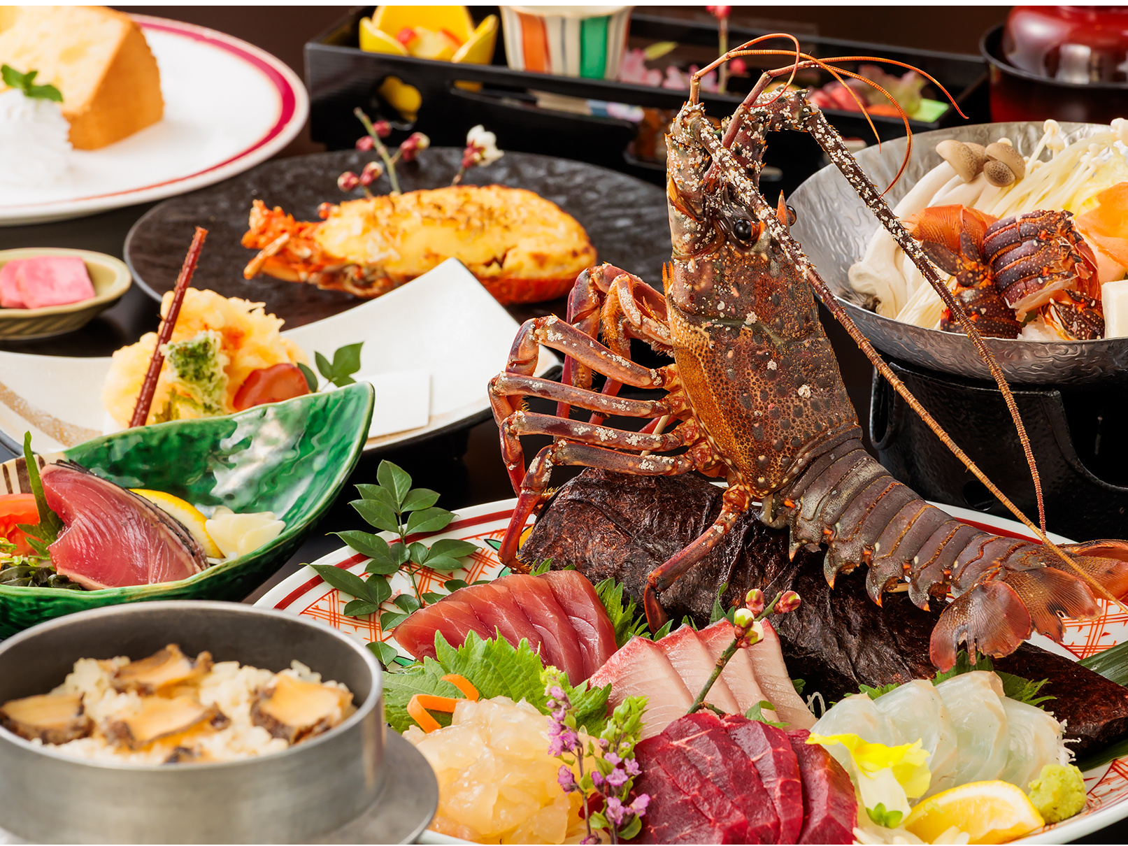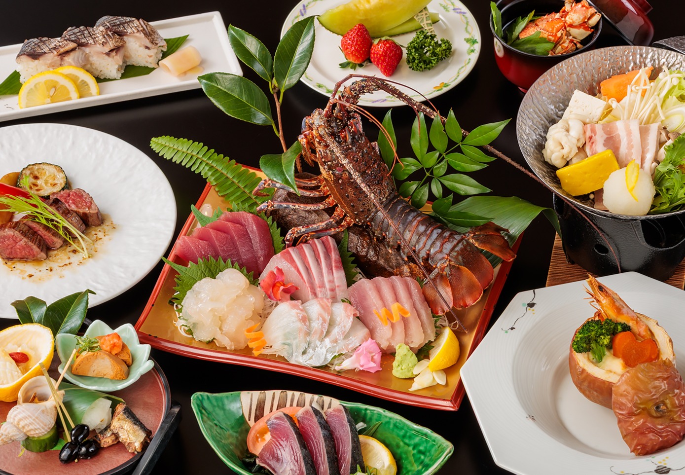 地元でとれた伊勢海老に、日戻り鰹の藁焼きやうつぼ、地元の野菜などを用い、美味しい料理をご提供します。