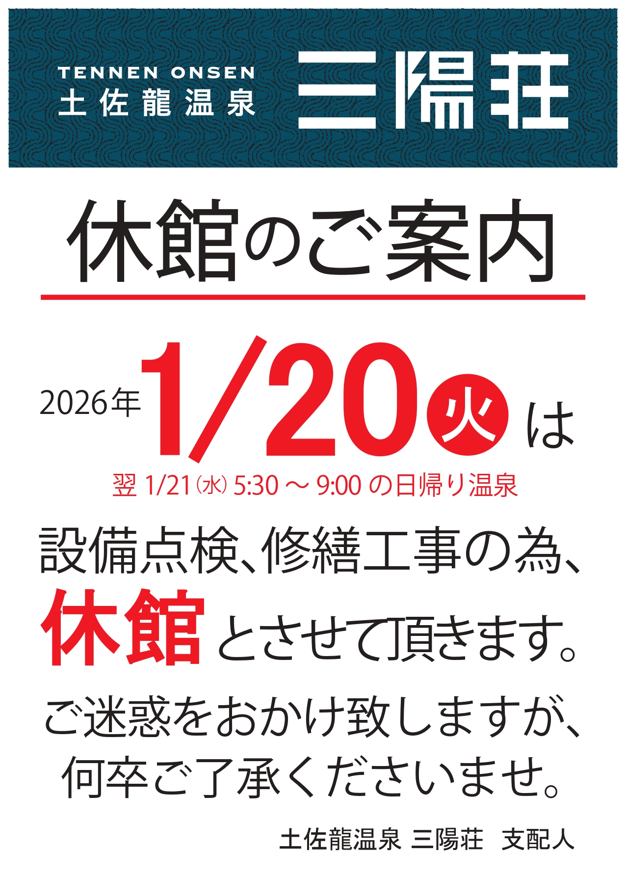 施設設備点検、及び修繕工事の為、令和8年1月20日㊋休館となります。